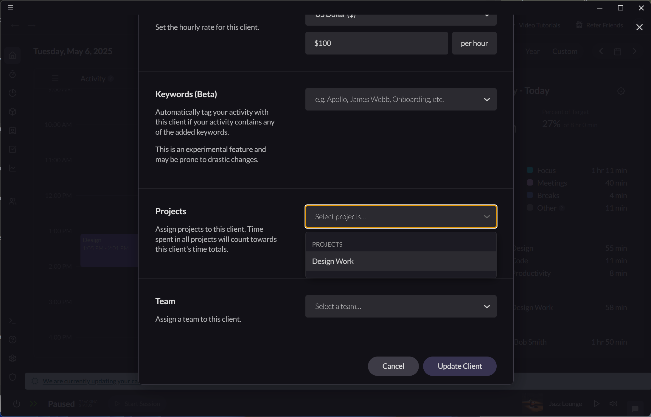 Projects can be associated with a specific client from the "Edit Client" modal. Once a project has been assigned to a client, the time spent in the project will count towards this client's time totals.