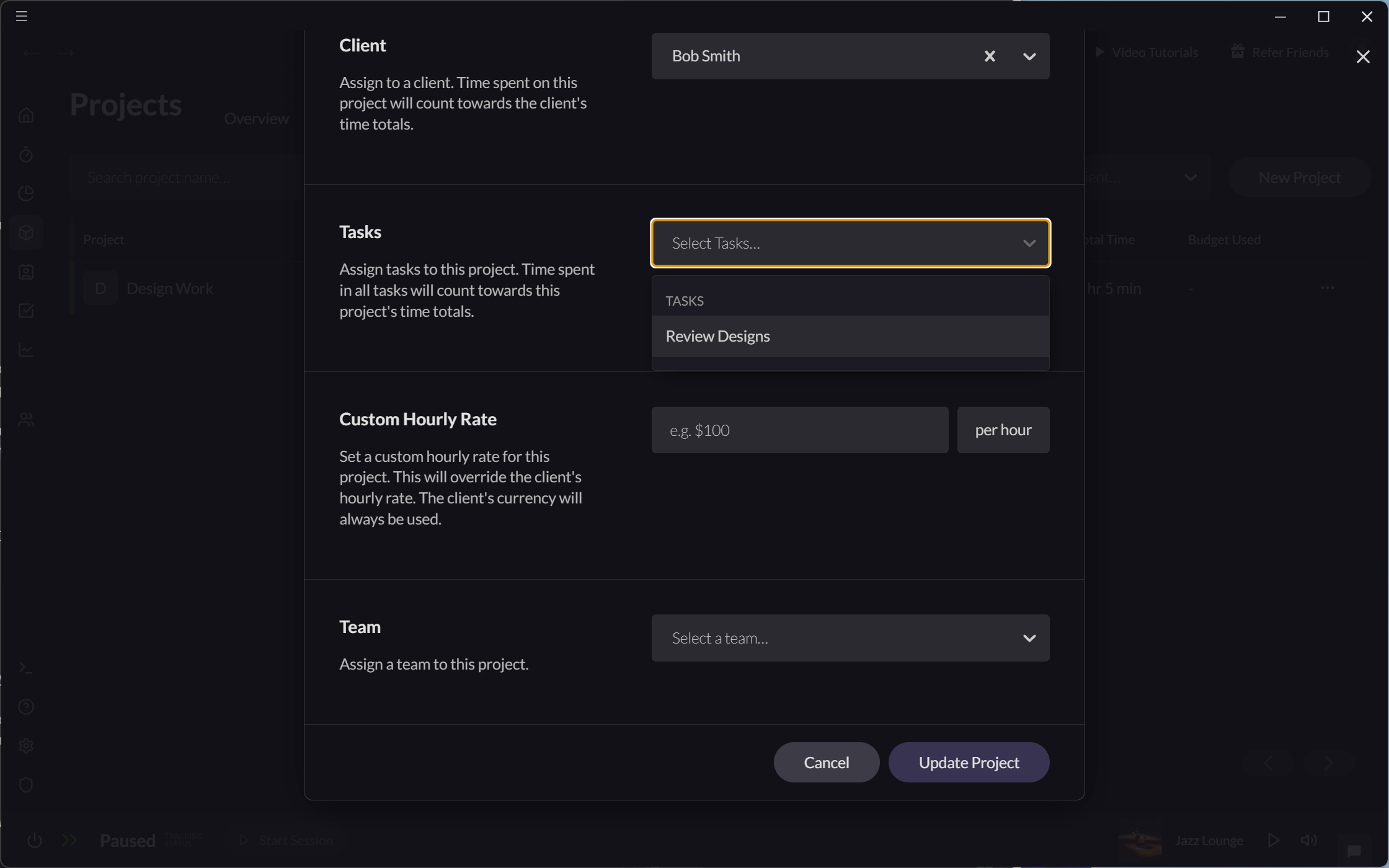 Projects can be associated with specific tasks from the "Edit Projects" modal. Once tasks have been associated with a project, the time spent on those tasks will also count towards the project's time totals.